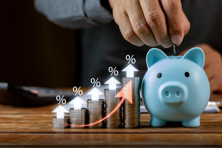 Investor saving money in piggy bank set future goals and success chart and upward arrow Save money to buy funds and investment profits, dividends, savings, interest savings.