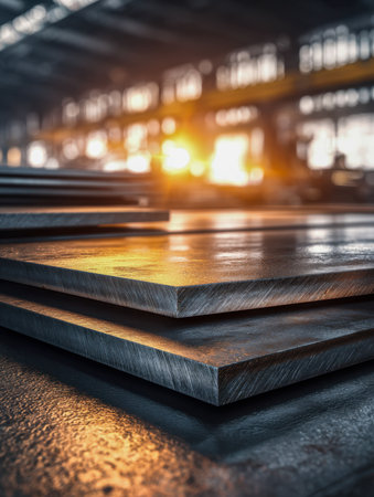 Gleaming metal slabs rest orderly on the warehouse floor, illuminated by intense overhead lights amid a vast industrial space with machinery softly fading in the bac