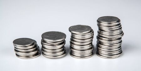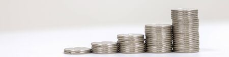 Increasing columns of coins, step of stacks coin isolated on white background with copy space for business and financial concept idea.