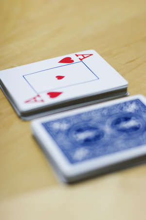 Deck of cards lying on a wooden table with the deck split in two and the ace on top