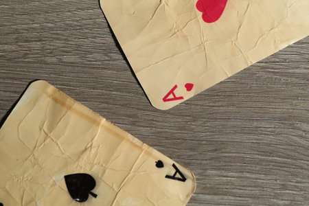 Playing cards close up, isolated on wooden table. Casino concept, risk, chance, good luck or gambling.