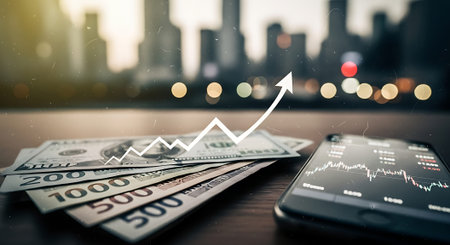 A stack of US dollar bills with a rising graph arrow, smartphone displaying financial charts, and a cityscape background on a dark wooden table.