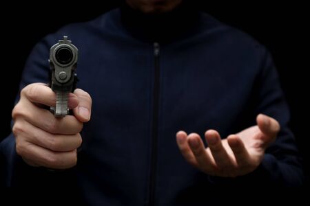 Angry emotional robber threatening with a gun
