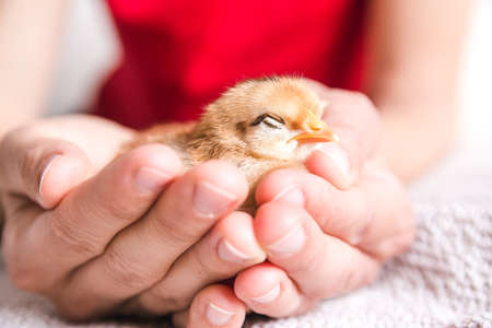Close view of baby chick in girl's hand