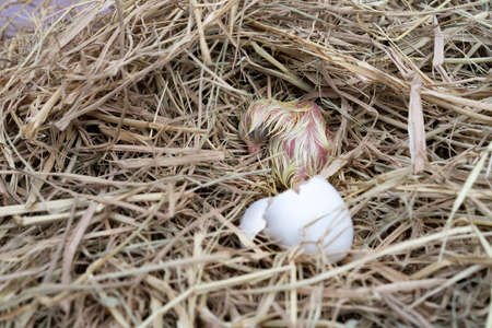 The baby quail in the nest is out of the egg.