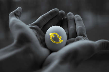 Human hands hold a chicken egg