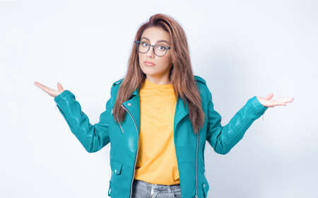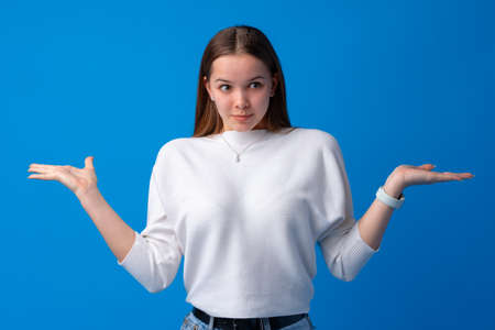 Confused teenage girl on a blue background spreads his arms. The girl gestures, shows that she does not know something.