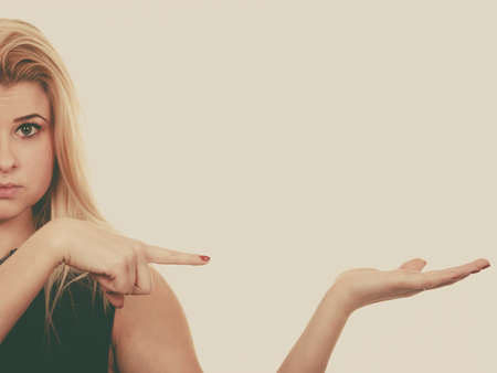 Paying attention to something, advertisement concept. Woman hands pointing with hands at blank copyspace