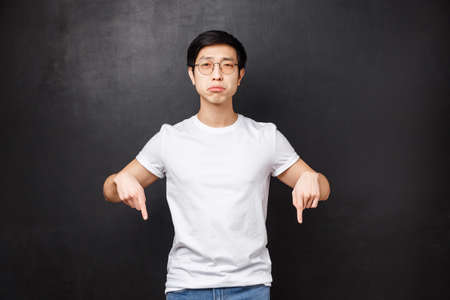Miserable and gloomy upset cute asian guy sobbing look at camera with regret and sadness, pointing fingers down at something broken or upsetting, feel uneasy, black background