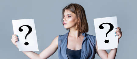 Girl question. Woman with doubtful expression and question marks. Thinking woman. Getting answers, thinking