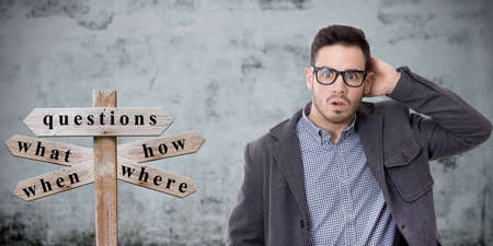 Confused Man have to choose the right arrow to follow. Concept of options, confusion, decision.