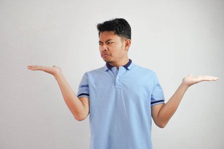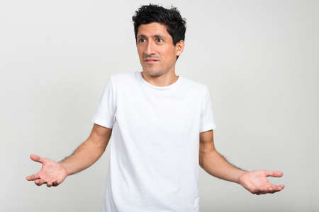Portrait of Hispanic man looking confused and shrugging shoulders