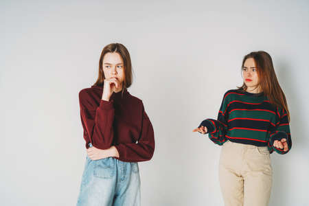 Two sisters twins beautiful girls hipsters in casual clothing on grey background isolated, quarrel, resentment