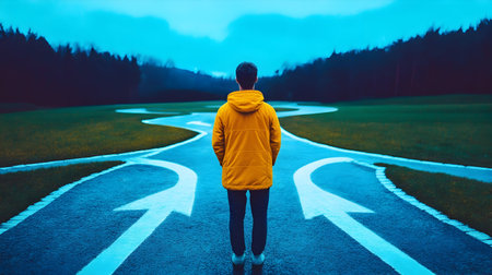 Surrounded by arrows pointing in different directions, a man contemplates his options at a crossroad, embodying the essence of choice and the unknown future ahead.