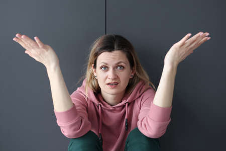 Confused beautiful woman with white skin, spreads her arms to the sides, smirks her face, feels doubt, while making a choice, dressed in a blue sweatshirt, isolated on a gray background.