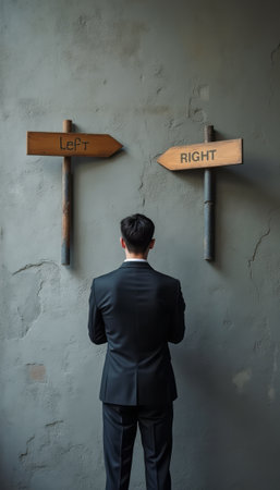 A well-dressed man stands in a sleek black suit, facing two wooden signs labeled Left and Right against a textured gray wall. This image captures the essence of decision-making, symbolizing the crossroads of life and the weight of choices we face.
