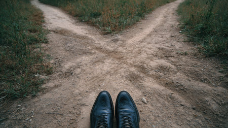 A symbolic image of black formal shoes positioned at a crossroads in a natural setting, highlighting choices and decisions in life amidst serene surroundings.