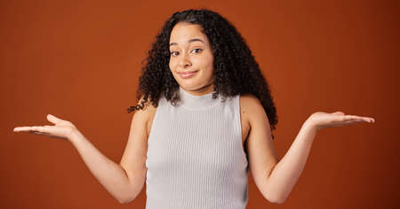 Shrug it off. Cropped portrait of an attractive young woman shrugging her shoulders in studio against a red background.