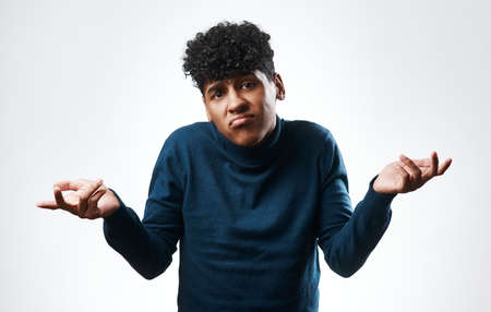 If youre looking for answers, I dont have any. Studio shot of a young man shrugging his shoulders against a grey background.