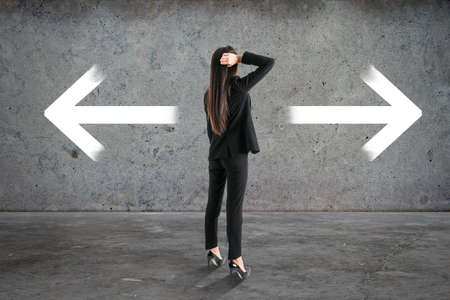 Back view of woman with two arrows in concrete interior. Different direction and choice concept