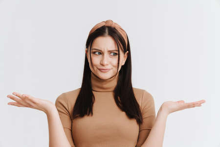 Confused frowning young brunette white woman in casual clothes standing over white background, shrugging shoulders