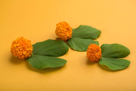 Indian Festival Dussehra, showing golden leaf (Bauhinia racemosa) and marigold flowers on a yellow background.