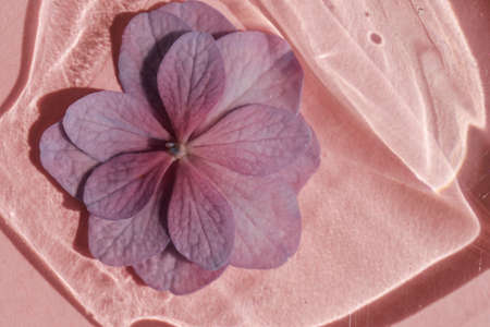 A drop of transparent cosmetic gel with flower on a pink background.