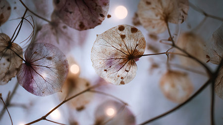 Dried hydrangea flowers with bokeh lights.