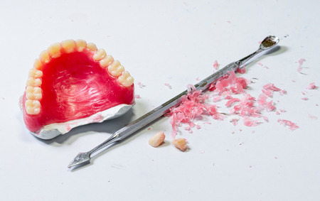 Broken acrylic denture. Dental phantom. Selective focus photo.