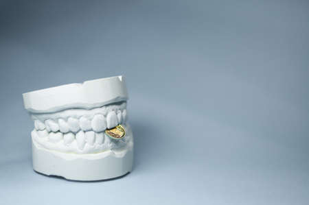 Orthodontic cast of human jaw for prosthetics and braces. Ceramic crown of a tooth on a plaster model of teeth, the work of a dental technician.