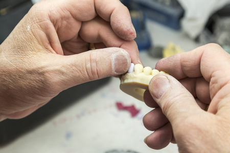 Dental prosthesis, dentures, prosthetics work. Prosthetics hands while working on the denture.