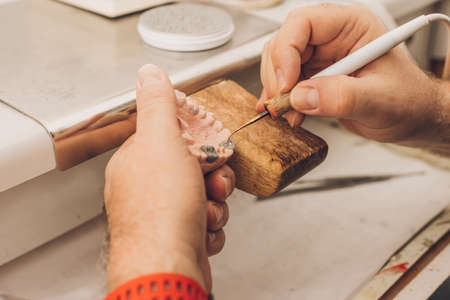 Dental technician doing partial dentures of acrylic resins in the lab.
