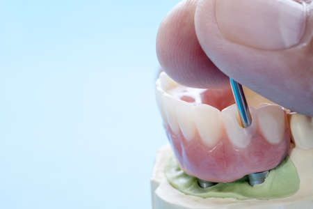 Closeup / Implant Prosthodontics or Prosthetic / Tooth crown and bridge implant dentistry equipment and model express fix restoration.