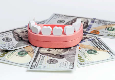 Jaw model with dollar bills. Teeth insurance and cost of tooth treatment, implantation, extraction concept. Money in stomatology. High quality photo