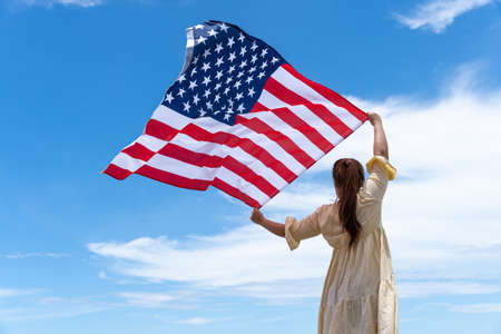 American flag outdoors. Woman holds usa national flag against blue cloudy sky. 4th July Independence Day