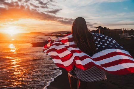 woman holding USA flag and looking at sunrice.