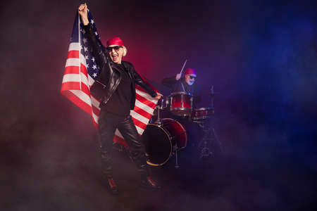 Photo of two retired energetic lady man rock legend group photographing hold america national flag play drum instruments wear trendy rocker leather outfit isolated black color background