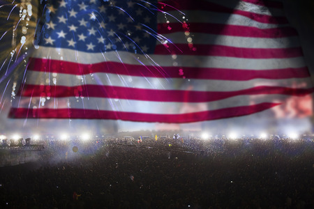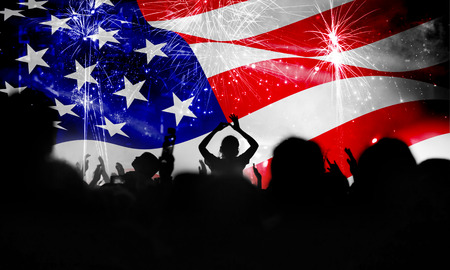 crowd celebrating Independence Day. United States of America USA flag with fireworks background for 4th of July