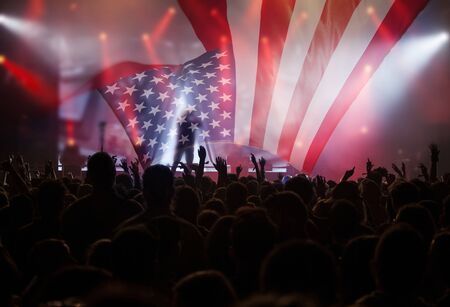 Crowd of people celebrating Independence Day. United States of America USA flag background for 4th of July.