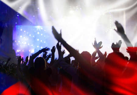 Football fans supporting Czech Republic- crowd celebrating in stadium with raised hands against Czech Republic flag
