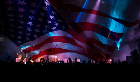 Concert crowd in front of a big screen with american flag