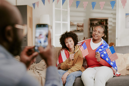 Black woman and Black child sitting on sofa holding American flags and smiling while man taking photo with smartphone during patriotic celebration at home