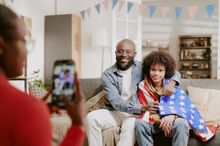 African American father sitting on sofa embracing teenager wrapped in American flag while woman photographing them with smartphone during family gathering in living room