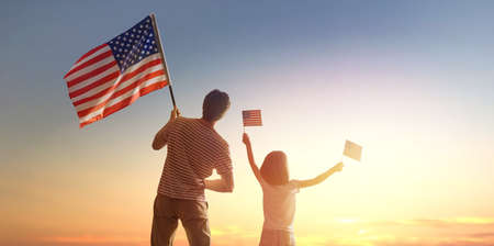 happy family with the flag of america USA at sunset outdoors