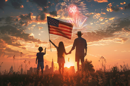 4th of July - Independence day of America. Happy family with national flags of United States against sky with fireworks