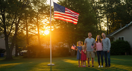 Modern American family with flags celebrating Independence Day