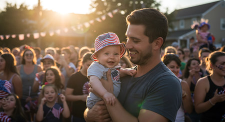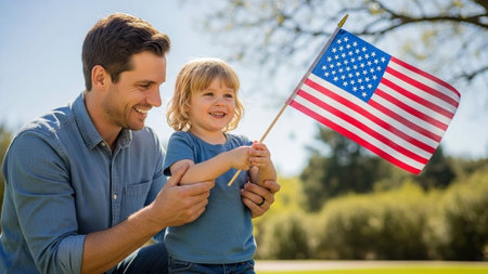 A happy father and child enjoying a sunny day with an American flag