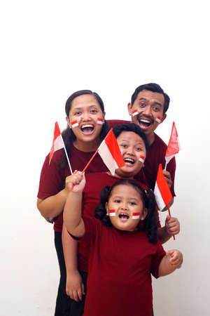 Happy asian family celebrate Indonesia Independence Day. Isolated on white background
