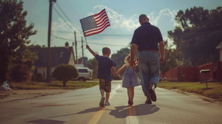 Family united on patriotic path. A man and two children walk hand in hand on a street, a boy waves the US flag.