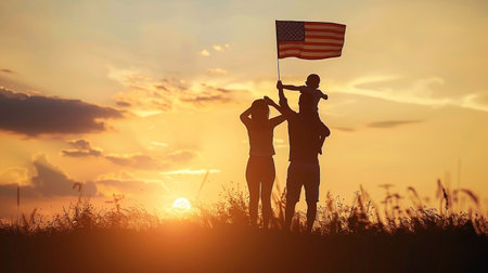 Family silhouette with US flag at sunset, joyful